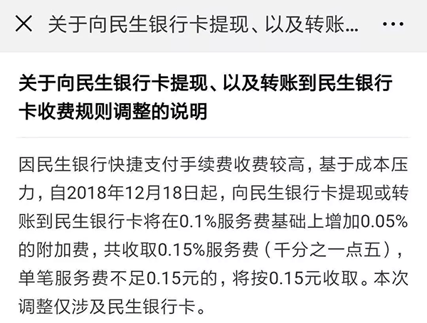 由于民生銀行快捷支付手續費收費較高,基于成本壓力,從微信零錢提現或轉賬到民生銀行卡需要在服務費0.1%的基礎上,加收0.05%附加費,共收取0.15%服務費(千分之一點五)。單筆服務費不足0.15元的,將按0.15元收取,本次調整僅涉及民生銀行卡,微信支付強調不會以收取提現服務費作為平臺的盈利手段。