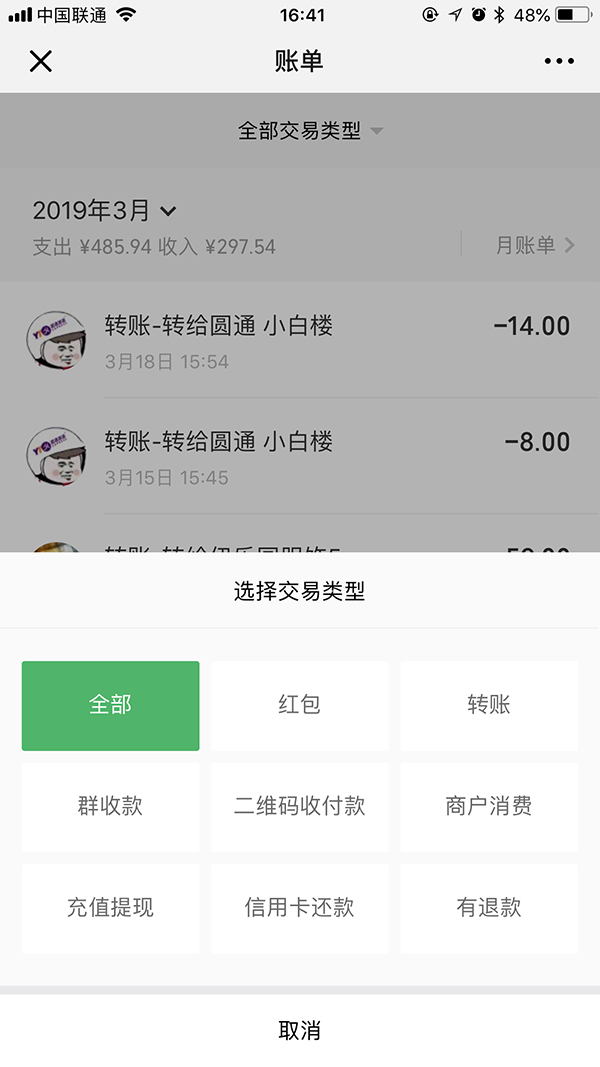 支付寶的賬單功能相信很多的人都使用過,其實微信也有這個功能,若想要查詢自己的微信賬單,首先打開微信支付,下方功能就有賬單查詢,還可以選擇交易類型,這個月剁手了多少錢,一目了然。